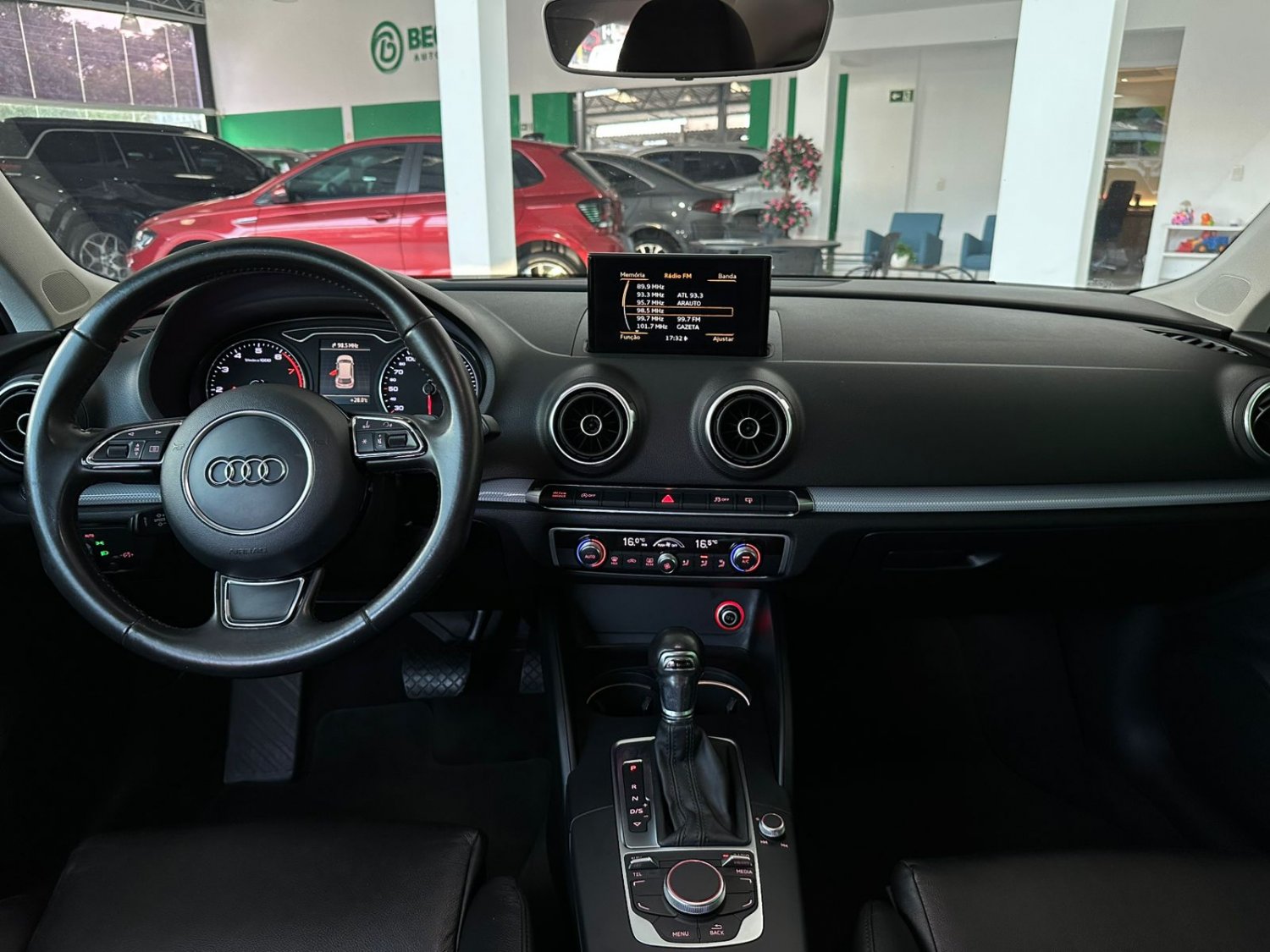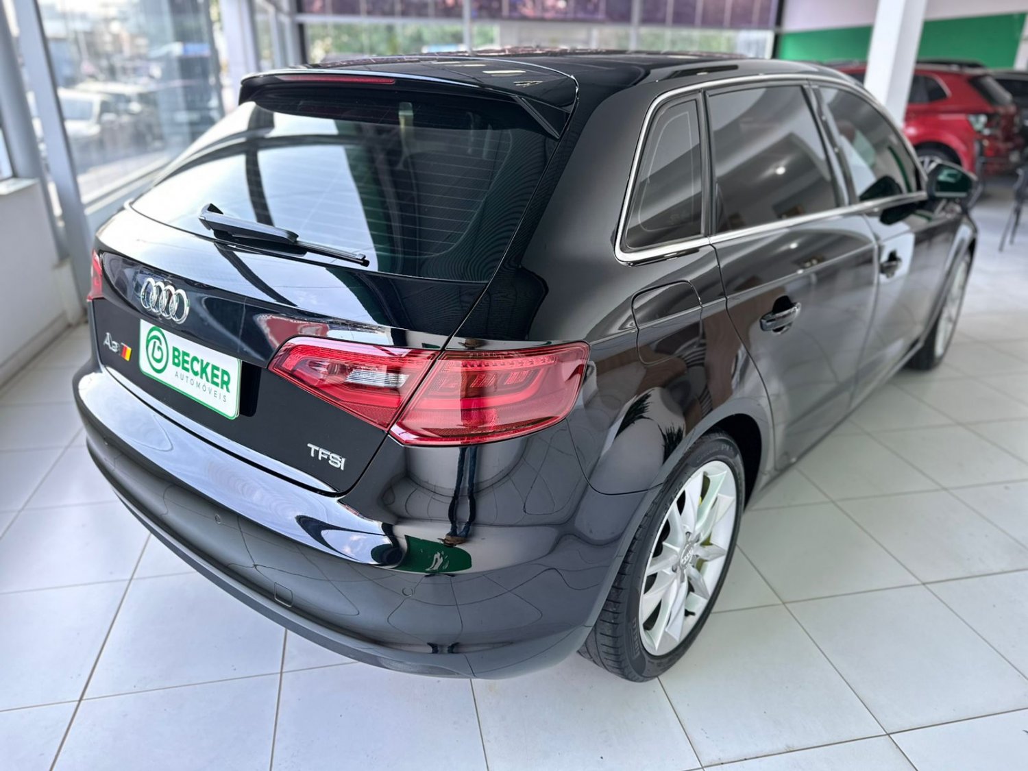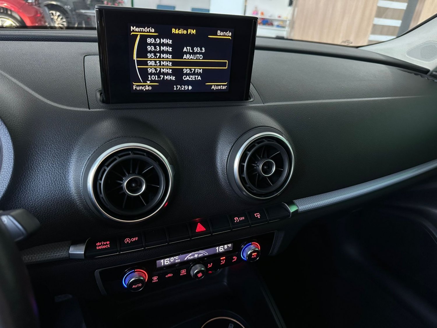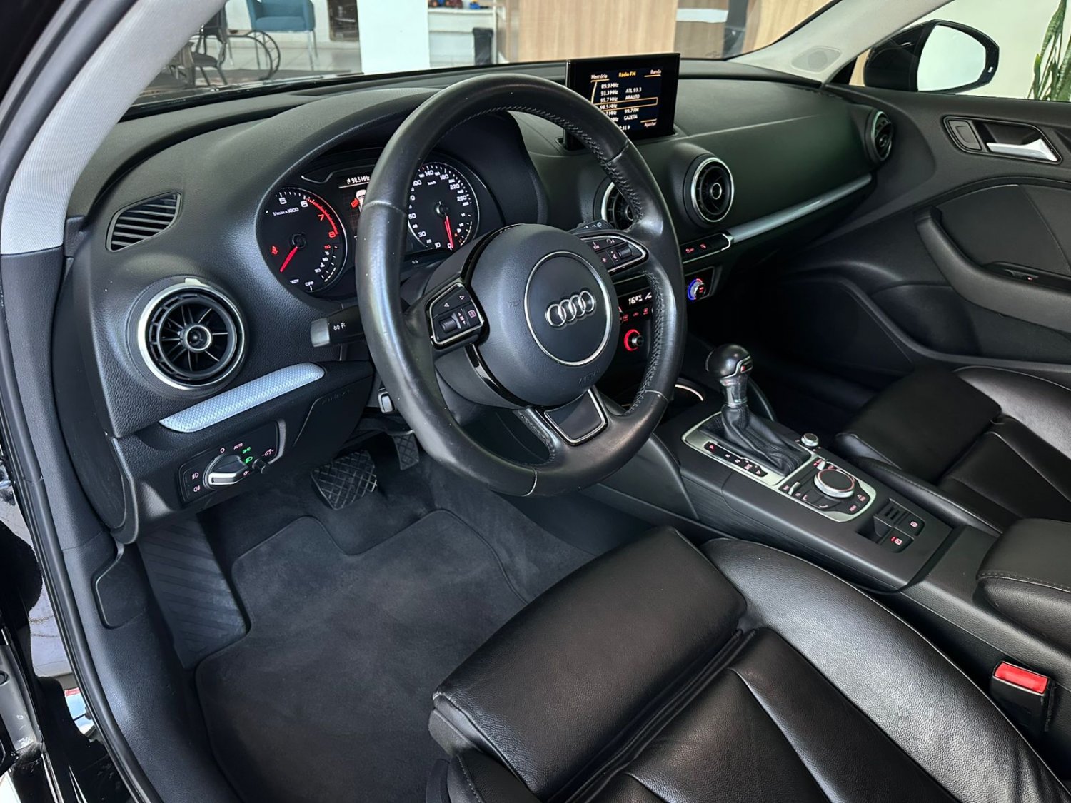 O Audi A3 Sportback 1.8 TFSI 2016 é um hatch premium com motor Turbo de 180 cv e 25,5 kgfm de torque, equipado com o câmbio S-tronic de dupla embreagem e 7 marchas. Suas características principais incluem aceleração de 0 a 100 km/h em 7,2 segundos, consumo médio de 10 km/l (cidade) e 12,5 km/l (estrada) com gasolina, porta-malas de 380 litros e suspensão traseira independente Multilink. De série, traz o sistema Audi Drive Select (modos de condução), faróis de xenônio com LED diurno, 7 airbags, controles de tração e estabilidade, freio de estacionamento eletromecânico, central multimídia MMI com tela retrátil, ar-condicionado digital dual zone, bancos de couro e rodas de liga leve aro 17".