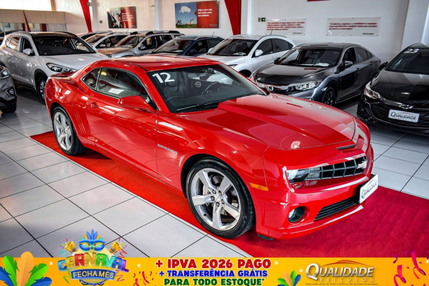 CAMARO SS 6.2 V8 AT 2012 na cor Vermelho Victory, uma RARIDADE sem igual, adquirido 0km em uma concessionária da serra gaúcha, conta com apenas 33.229km, com revisões em concessionária. Carro impecável, em sua mais bela configuração, e originalidade. Sem alterações estéticas e mecânicas, nem sequer uma película nos vidros ele já teve (salvo catback full inox, que nós mesmos instalamos, por que acreditamos que este autêntico muscle car V8 precisa e, deve sair do silêncio para, tocar a melhor música que seus ouvidos podem escutar! acompanha escapamento original). Possui um belíssimo, robusto e confiável motor V8 6.2L com corrente de comando e, variação de admissão, capaz de gerar até 406cv a 5900rpm e torque de 56,7kgfm a 4600rpm. Aliado a um cambio automático de 6 velocidades, com conversor de torque integrado. No pacote de opcionais estão incluídos: ar condicionado, direção hidráulica, trio elétrico, volante multifuncional, paddle-shifts, computador de bordo, head-up display, monitoramento de pressão dos pneus, rádio original, Bluetooth®, USB, câmera de ré, sensor crepuscular, retrovisor fotocrômico, bancos em couro c/ ajustes elétricos, sistema de som premium Boston Acoustics, chave telecomandos c/ partida remota, rodas de liga leve, sensores de estacionamento, Airbags frontais, laterais, de cortina e ABS. Se você deseja adquirir o CAMARO mais novo do RS, vem com a gente! HÁ 14 ANOS, A QUALIDADE VEÍCULOS COMERCIALIZA SEMINOVOS DE ALTA QUALIDADE, RIGOROSAMENTE SELECIONADOS E REVISADOS NOS MÍNIMOS DETALHES, PARA TORNAR O SONHO DO CARRO NOVO UMA REALIDADE AGRADÁVEL E INESQUECÍVEL. COM UMA NOTA MÉDIA DE AVALIAÇÃO DE 9,9. NOSSOS PRODUTOS E SERVIÇOS REFLETEM A SATISFAÇÃO DOS MILHARES DE CLIENTES FIDELIZADOS, QUE FAZEM PARTE DA FAMÍLIA QUALIDADE VEÍCULOS. FAZER PARTE DAS SUAS HISTÓRIAS É O QUE NOS MOVE.. Adicionais: Direcao Hidraulica, Travas Eletricas, Vidros Eletricos Dianteiros, Retrovisores Eletricos, Desembacador Traseiro, Volante com Regulagem de Altura, Camera de Re, Bluetooth, Conexao USB, Controle de Tracao, Controle de Estabilidade, Farois de Neblina, Sensor de Luz, Piloto Automatico, Volante Multifuncional, Paddle Shift, Head-Up Display, Retrovisor Eletrocromico