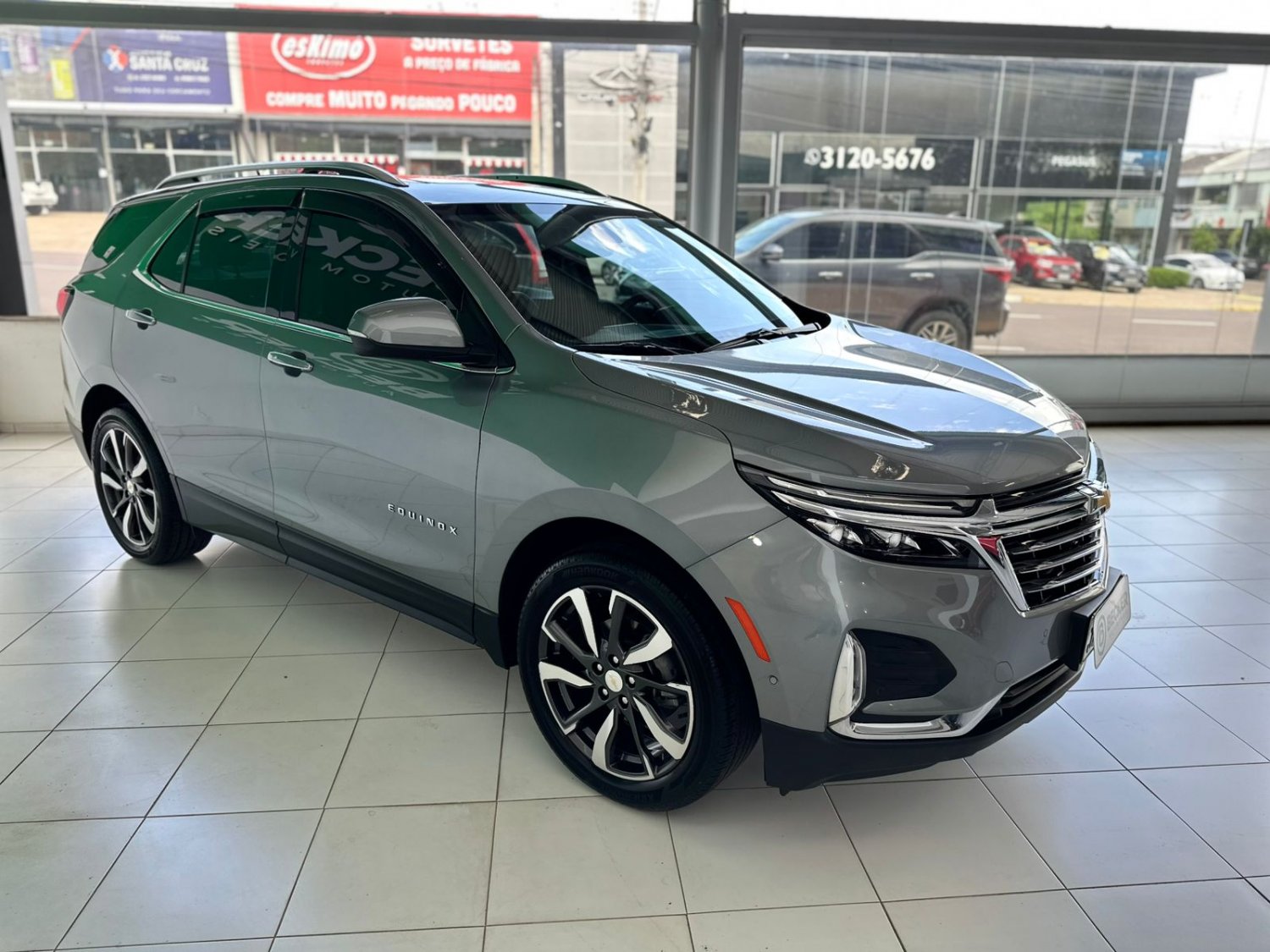 O Chevrolet Equinox Premier 1.5T 2023 é a versão topo de linha do SUV médio, equipada com motor 1.5 Turbo de 172 cv, câmbio automático e tração integral AWD, destacando-se pelo máximo de luxo, tecnologia e segurança da linha. Suas principais características incluem acabamento externo cromado, rodas aro 19, interior refinado com sistema de som Bose, teto solar panorâmico, porta-malas com abertura por sensor de movimento e um pacote completo de assistência ao condutor, como frenagem autônoma e assistente de estacionamento semiautomático.